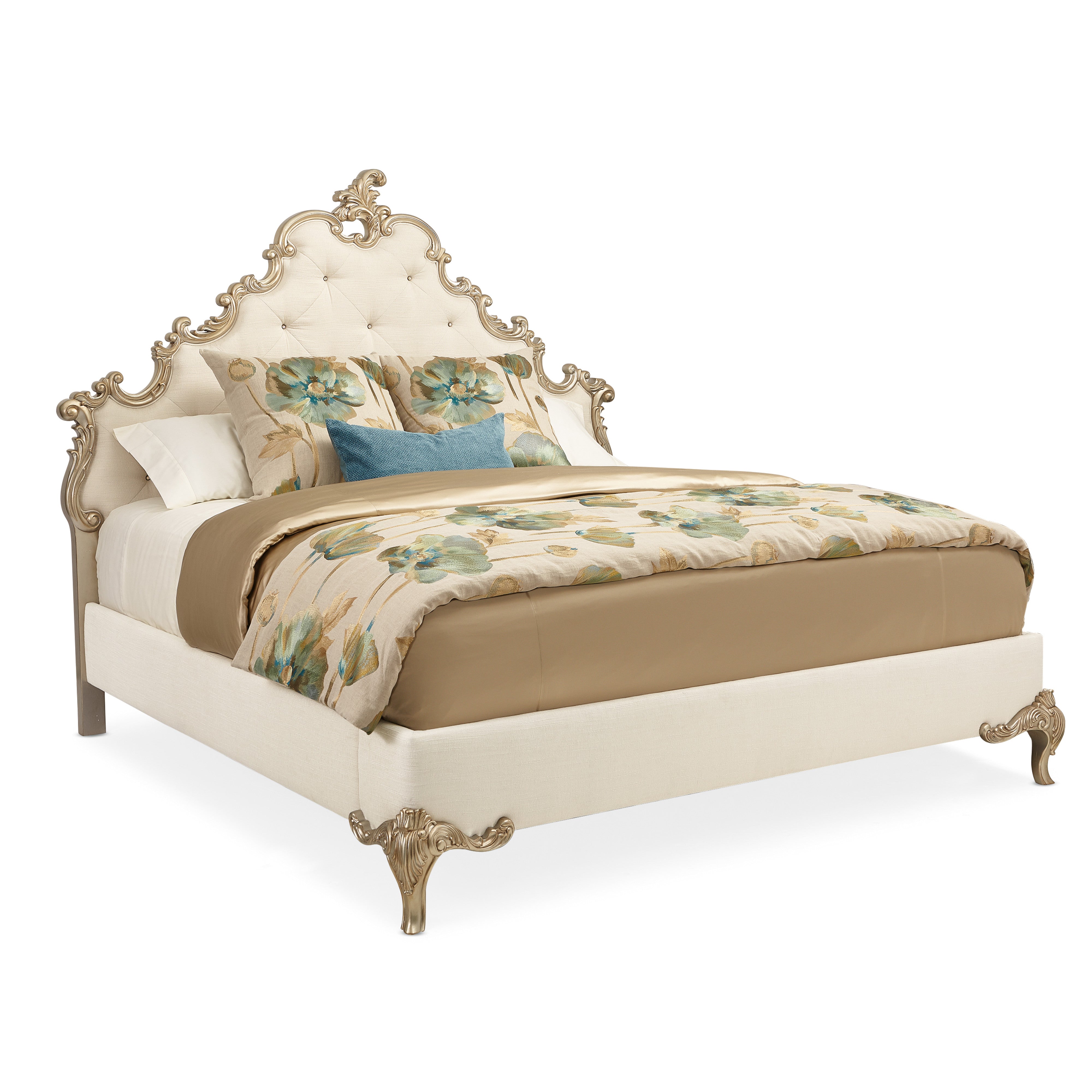 Imagine a bed perfectly at home in a European chateau and you’ll get a sense of the dramatic beauty this singular panel bed offers. Drawing inspiration from vintage Rococo design, it features intricate carvings reminiscent of the period and accentuated with a painted metallic finish in Effervescent. Grand in presence, this impressive bed has been thoughtfully scaled to offer a footprint that will complement today’s homes. Its luxuriously upholstered head panel is tufted in a diamond pattern and accented with opalescent nail heads. From top to bottom, this decadent bed offers everything you could wish for—and more.