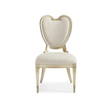 Boasting rich period-inspired detailing, this center side chair is the ideal mate for a statement dining table. Its plush seat and seat back are richly upholstered on both the inside and outside and have been tailored to perfection. Outlined in an elegant frame, this arm chair wears a Champagne Mist finish while its classically inspired carvings are highlighted in Aglow. Metal ferrules add a modern touch to its front legs and complete the glamorous look.