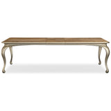 If you’re looking to take your dining room to new heights, look no further. Designed to impress, this spectacular rectangular dining table commands attention and conveys luxury in every detail. You may never use a tablecloth again once you see this one-of-a-kind table’s silkscreened top inspired by antique marquetry and accented with Mother of Pearl inlay. Three stunning signature finishes of Cendre, Champagne Mist, and Aglow combine to create a rich mix of metallics that reflect light and cast a warm glow. Shapely cabriole legs featuring period carvings support this table’s grand top and flow smoothly into the apron. Perfectly sized at 84 inches, the dining surface can be expanded to 120 inches with the addition of two 18-inch leaves—transforming easily from family dinners to entertaining.