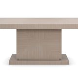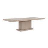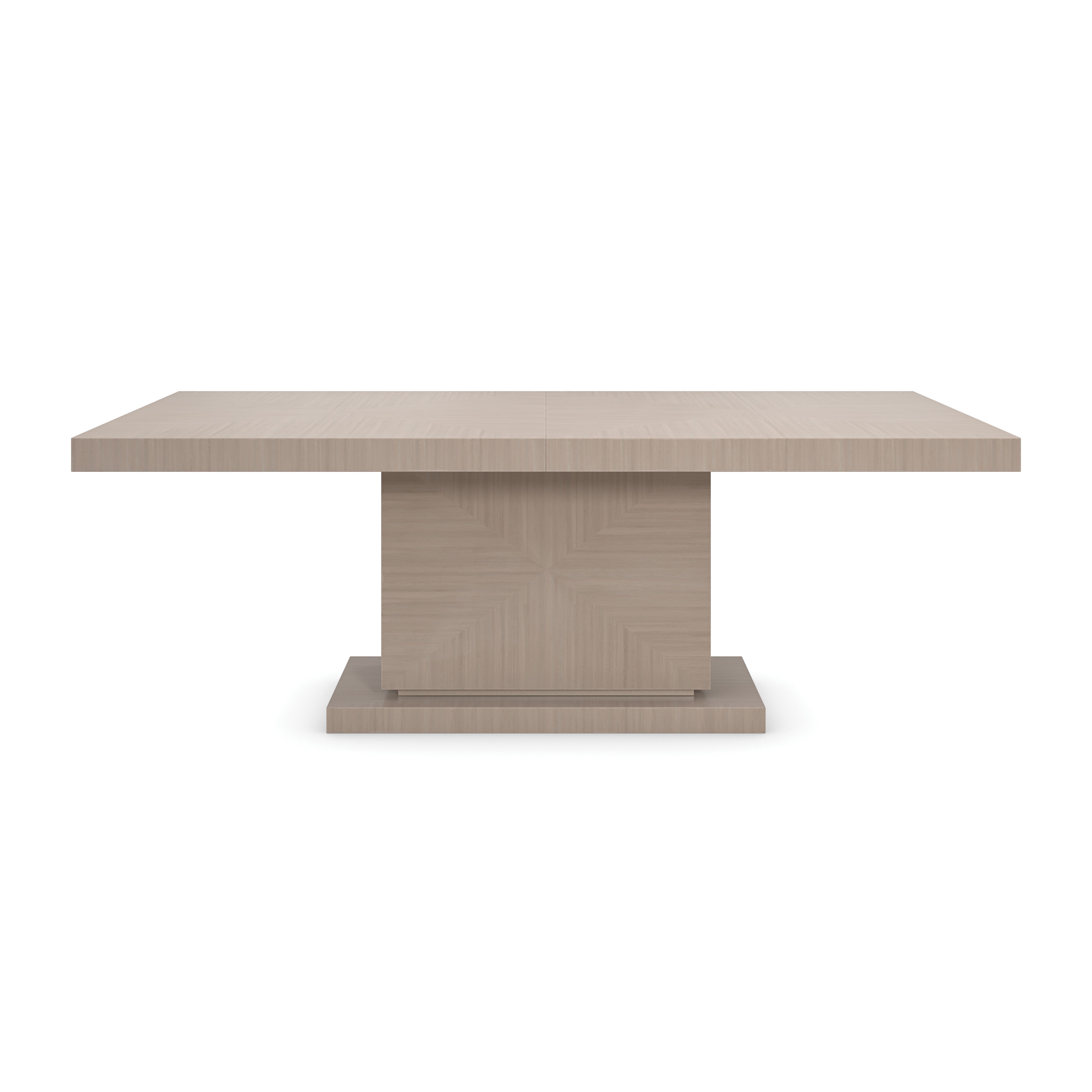 Inspired by classical architecture, this dining table introduces a minimalist form with a strikingly balanced design aesthetic. A tonal Woodland Gray finish naturally highlights the exquisite linear wood grains of Japanese Sen Veneers, offset by a slim horizontal reveal in Sparkling Argent to accent its monolithic base. An expansive tabletop extends to 105” with a self-storing butterfly leaf to easily accommodate up to 10 guests.