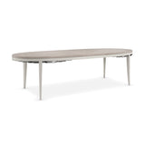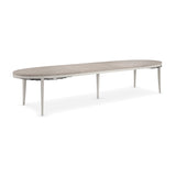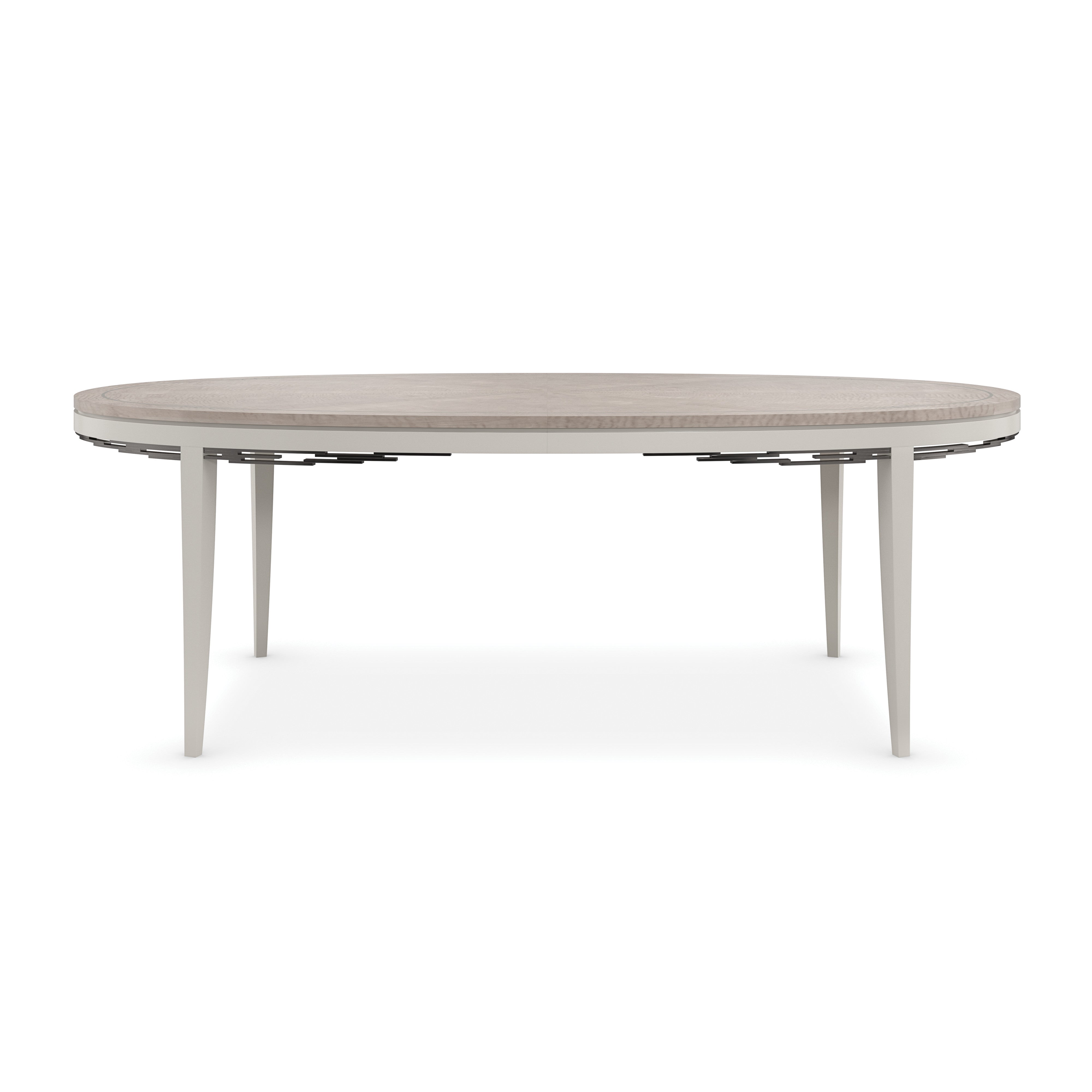 This spacious, oval-shaped dining table makes an elegant statement with a radiating pie veneer pattern on top, intricately crafted from Grey Curly Maple. A neutral Chinchilla finish gives light to flaring wood grains, delicately framed by a silkscreen pinstripe detail in Soft Silver Paint that repeats the decorative metal fretwork beneath the apron. Includes three 22” leaves that allow you to easily extend the table and seat up to 12 guests.