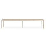 There’s always room for more with this extension dining table, evoking a balance between refined simplicity and modern functionality. Highlighting the intricate wood grain, the tabletop is finished in Moonstone with mitered edges in Almond Milk. Tapered legs, also trimmed in Dark Chocolate, appear to flow from the tabletop like a waterfall. Comfortably seats 8 without leaves, and seats 14 when fully expanded with three leaves.