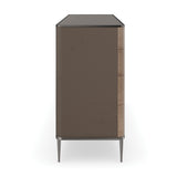 Exquisitely crafted in Chocolate Tiger Maple, this standout dresser features a double starburst-patterned veneer radiating up and outward from its bottom drawers. Soft, rounded edges introduce a refined, organic aesthetic, finished in Galaxy Bronze and framed in Deep Bronze metal. For a distinctive finishing touch: painted drawer interiors and faceted hardware, carved from ivory resin and encased in Deep Bronze metal