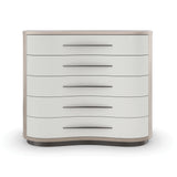 Free-flowing in nature, this sinuously shaped dresser makes a simple, yet elegant, organic statement. Vinyl-wrapped drawer fronts accentuate its gentle curvature and offer subtle contrast to Koto veneers in a pearlescent Moonstone finish. Five soft-close drawers offer tucked-away storage, with horizontal hardware and painted interiors for an unexpected finishing touch. A removable tray in the top drawer neatly keeps jewelry, trinkets, and cufflinks.