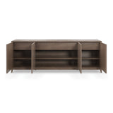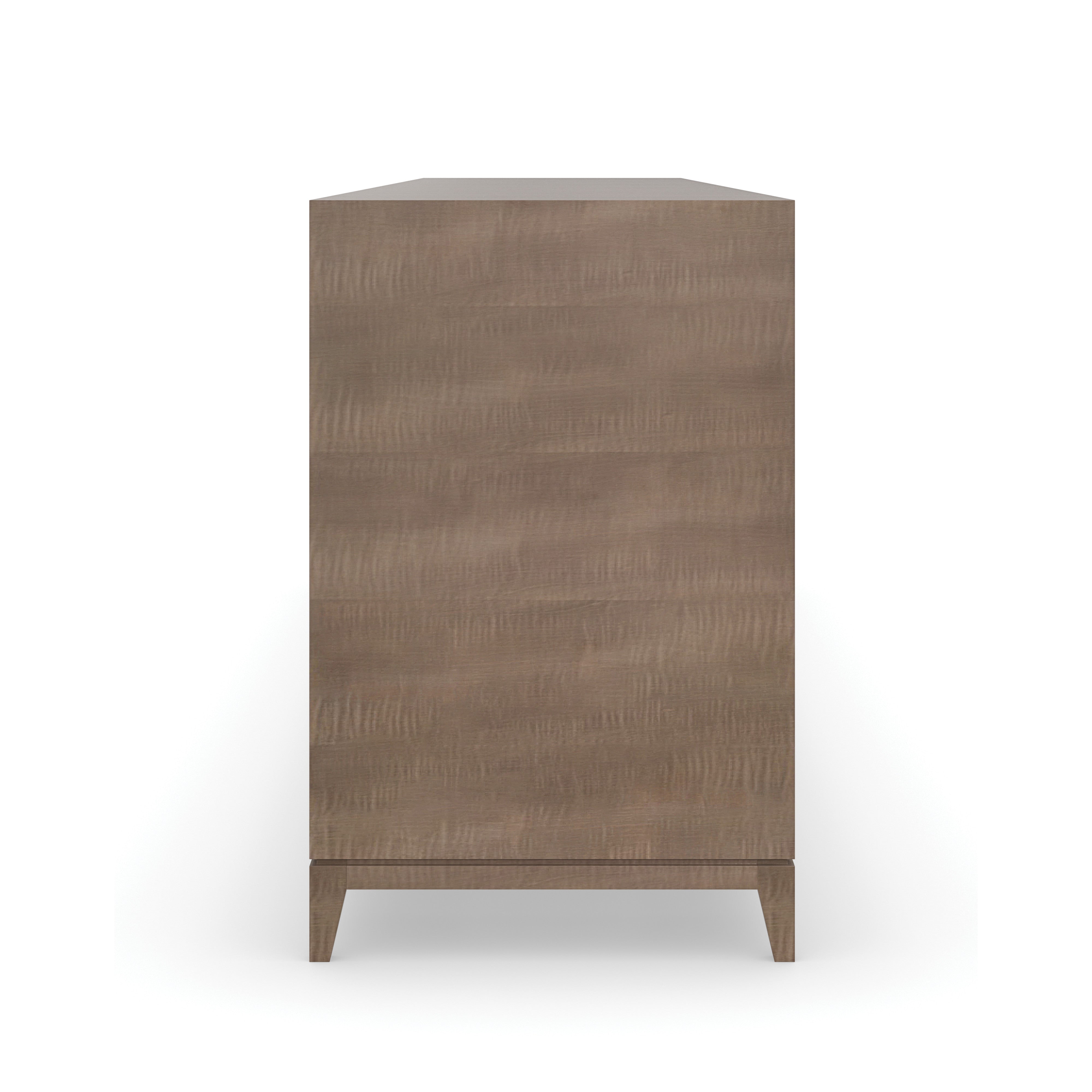 A rich Mocha finish calls attention to Elegant Tiger Maple veneers in a radiating starburst pattern. This amply sized credenza features four interior drawers and three adjustable shelves behind touch-latch doors for a clean-lined storage option with endless style potential. Makes a striking first impression in entryways, living, and dining interiors.