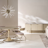 Stone, mirror-polished metal and hardwoods crisscross in this sleek media cabinet with linear appeal. Flowing Sandstone graces the 84” top of the Pearl-painted cabinet and four doors. The paint gives off just enough luster to make the piece intriguing. The doors have slim Whisper of Gold pulls. Adjustable shelving and wire access graces the inside of the cabinet. The base is the real stunner of the piece with thin intersecting bars in mirror-polished Whisper of gold that overlap each other and extend up the cabinet to add interest.