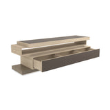 Enhancing the “La Moda” suit of pieces, La Moda Media Console is distinguished by the architectural offset stacking of mixed materials. The top frame showcases Koto veneer wood finished in Dry Martini and inset with Smoked Bronze mirrored glass. The table tiers are Koto in Dry Martini with a Neutral Metallic finish. There is a three-drawer storage area with touch latches and Smoked Bronze mirrored glass fronts. The plinth base is finished in Neutral Metallic.