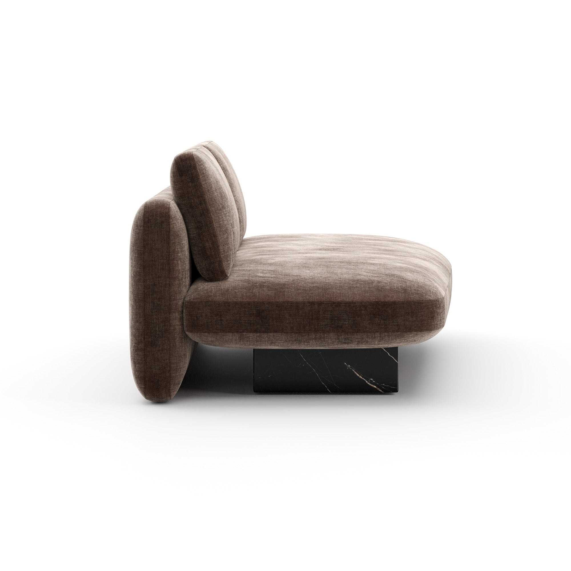 Discover the epitome of contemporary luxury with the Overlap Armless Bumper. Its striking dark taupe vintage velvet upholstery harmonizes perfectly with the distinguished Nero Marquina stone base, offering an irresistible invitation to linger in refined relaxation.