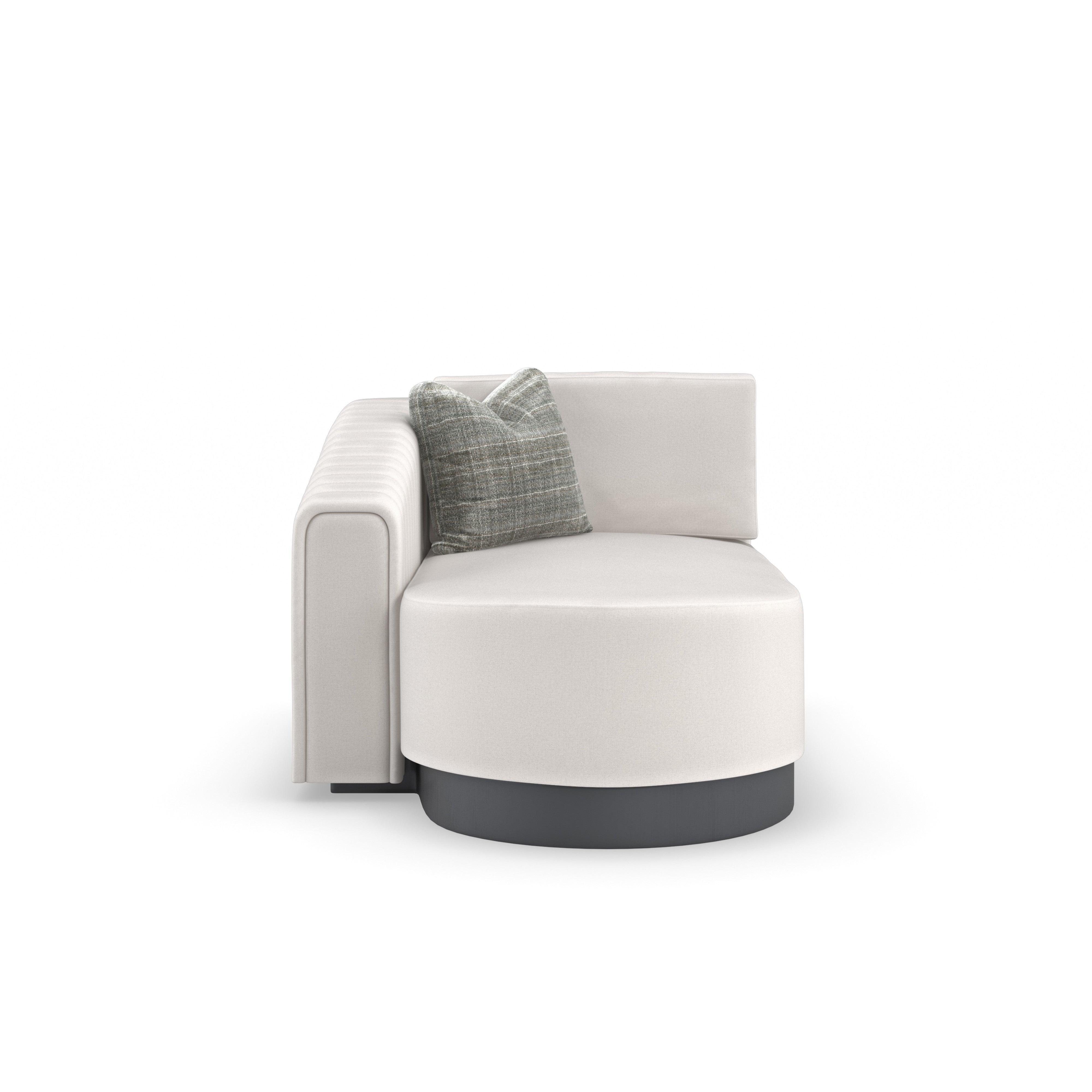 A minimalist design with distinct Euro-modern style, this four-piece sectional is architectural, yet softly rounded for a luxurious lounging experience. Expertly tailored in a brushed twill performance fabric, it features a quilted channel detail along the outback and arms, with inset front panels for added flair. Boxed accent pillows bring a pop of color, contrast, and pattern. Adding depth and dimension: a recessed plinth base in a rich Iron Ore finish. Includes a right facing or left facing chaise, loveseat, corner chair, and armless chair.