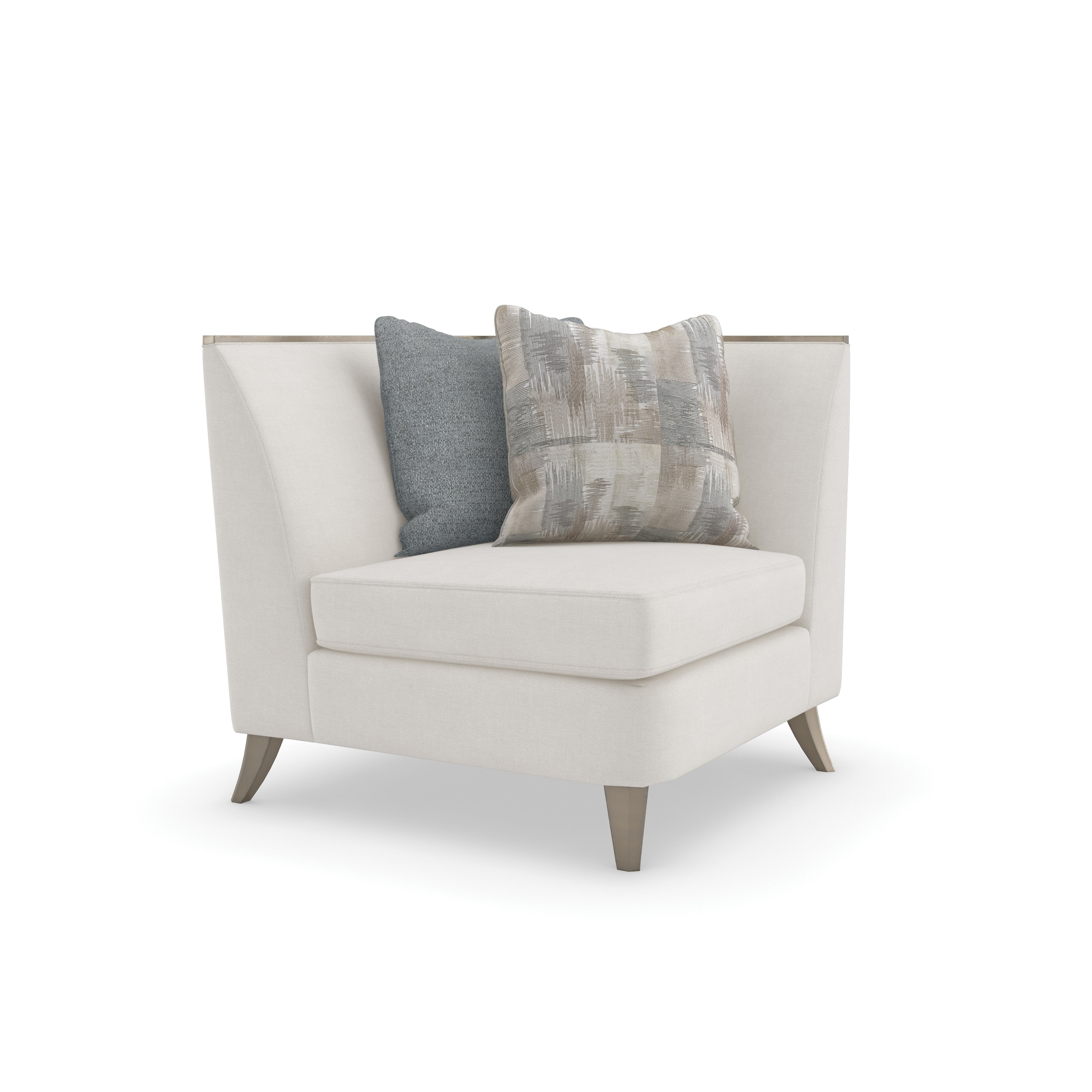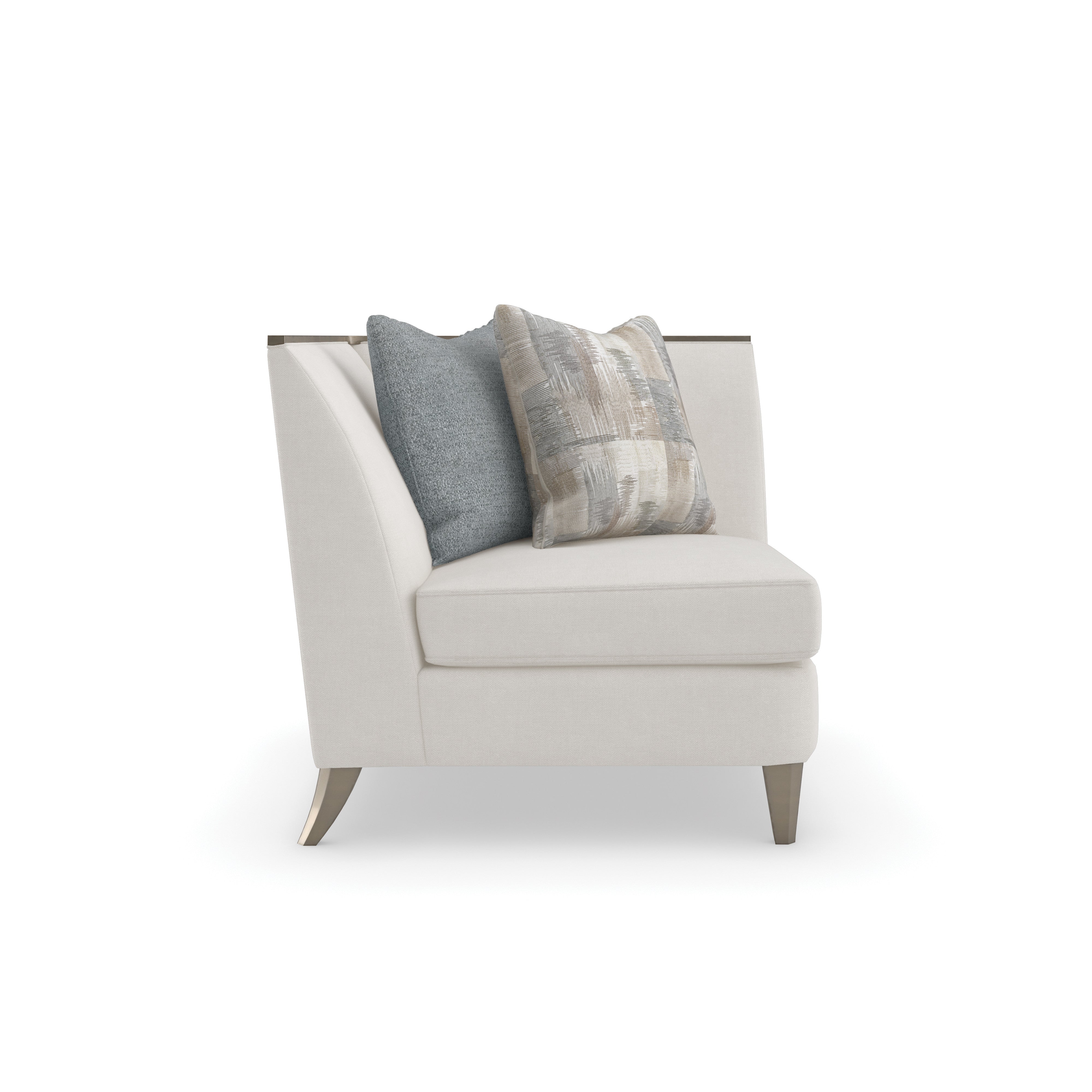 Make an elegant seating statement with this five-piece modular sectional, eloquently mixing classic and contemporary design details. A metallic Charcoal Leaf finish accentuates its wood-trimmed silhouette, made modern with a carved crisscross pattern that draws the eye to gently sloping arms and splayed legs. Dressed in a fashionable herringbone performance fabric with a luxuriously soft hand, and feather-down toss pillows in a calming palette of blue and silver hues. Fill a larger space for entertaining, or style pieces individually for a more intimate, custom seating experience. Matching X Factor chair also available.