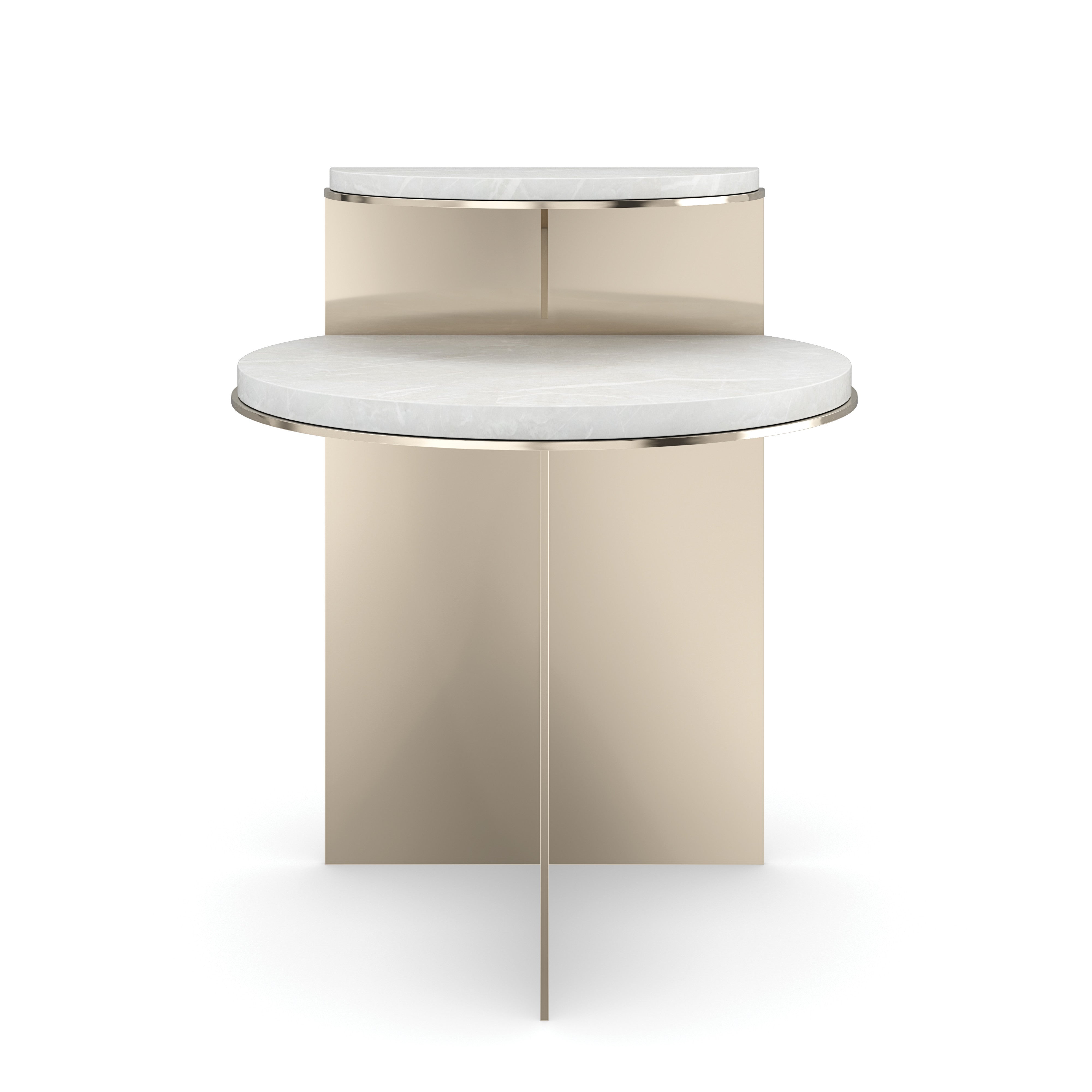 Simple yet elegant with an emphasis on function, this curved end table adds depth and reflection to seating areas. Features two tiers of White Rhino stone atop an angular metal base finished in a Whisper of Gold. A standout on its own, even more memorable in pairs.