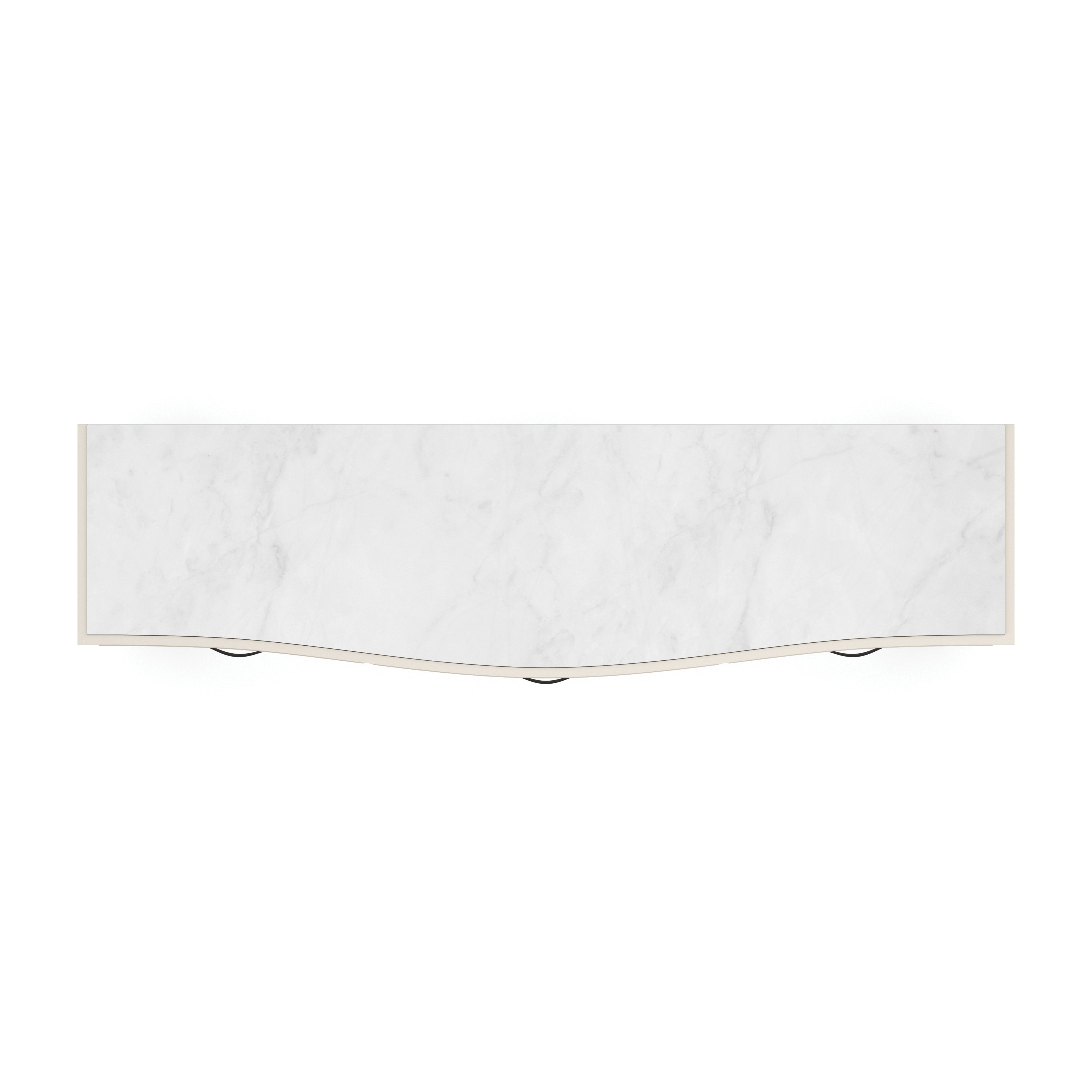 A beautifully figured wood grain lends a natural embellishment to this contemporary buffet, crafted in a modest yet memorable mix of materials and finishes. Linear drawer pulls create a sense of repetition, with a subtle arching curve and faux shagreen inlay. Adding to its subtle flare: stacked metal fretwork beneath the base and decorative ferrules in a Deep Bronze finish. Offers ample storage for serveware, linens, and other entertaining essentials.