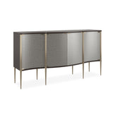 Give your room endless character by incorporating this shapely, shimmering cabinet in your design plan. Serpentine in shape, it boasts an intriguing mix of materials and features extraordinary curved glass doors crafted with a textured pattern on the inside. Metal posts and hardware finished in Zinc add contrast to its Seal Skin and Whisper of Gold exterior. Ideal in the dining room or living room, this stunning design casts a warm metallic glow when bathed in light.