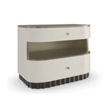Designed with the utmost attention to detail, this bedside table celebrates the timeless beauty of neoclassical architecture. Features two drawers with soft corners and vertical micro fluting in Ivory paint, separated by open space for bedside storage and display. A Brushed Whisper of Gold on top adds warmth and a note of luxe, accentuated by an overscaled fluted base in a richly contrasting, Dark Chocolate finish.